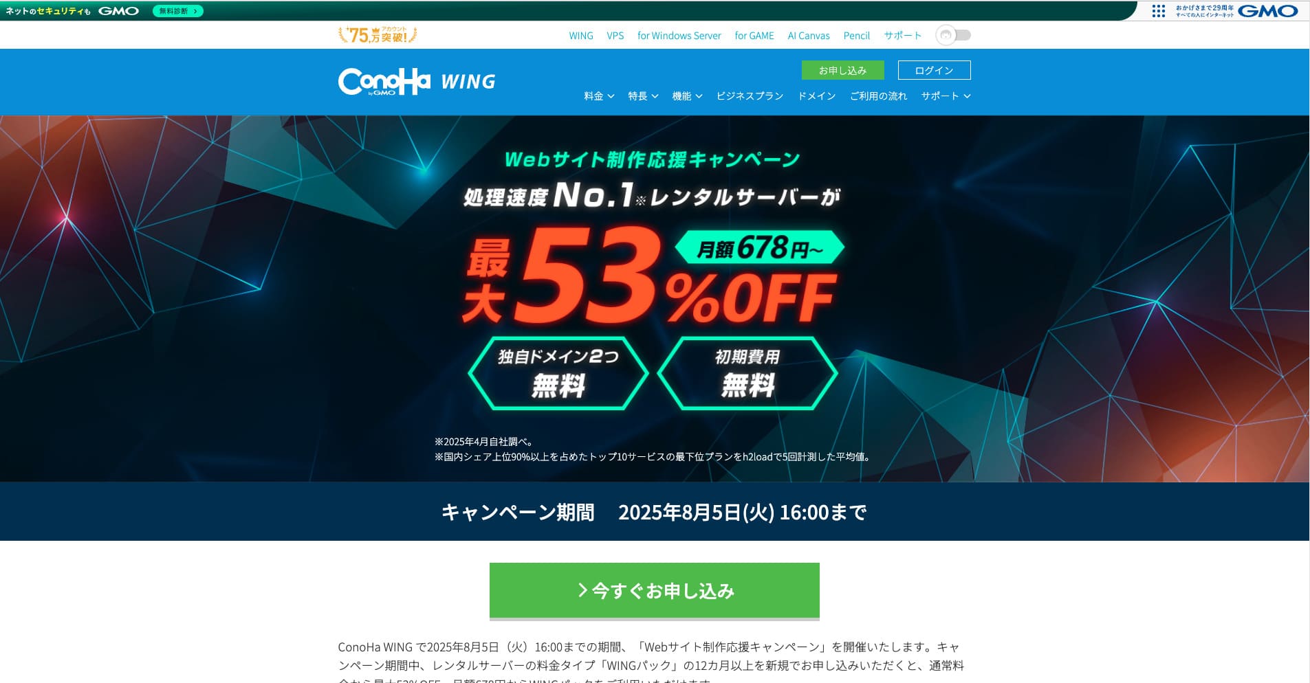 2025年8月5日までサーバー代最大53%OFF&ドメイン2個永久無料 & 初月無料
